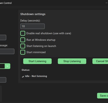 Remote Shutdown Control es una aplicación de escritorio pensada para integradores y usuarios profesionales que necesitan apagar equipos de forma remota y controlada. Ofrece escucha por UDP y por puerto serie (RS232), cuenta regresiva configurable, guardado de configuración y un interruptor de seguridad que evita apagados accidentales.