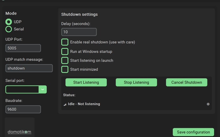Gestiona apagados remotos mediante UDP o RS232 con una interfaz moderna, opciones de autostart en Windows y un modo de simulación para pruebas seguras.