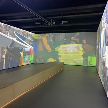 Por otra parte en lo que se conoce como sala 360º, habían 5 videoproyectores Epson Led puestos en blending. al tener que montar ópticas de ultracorta distancia, teníamos que calcular al milímetro la colocación de los soportes.