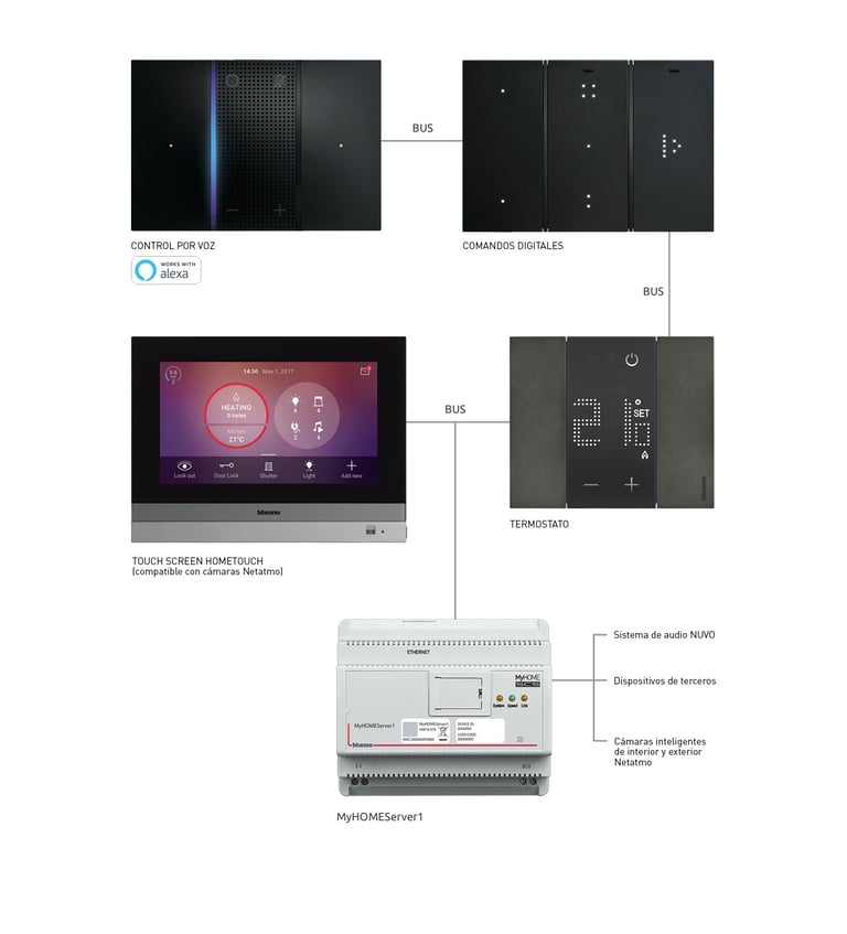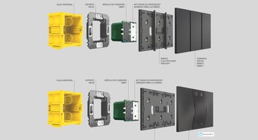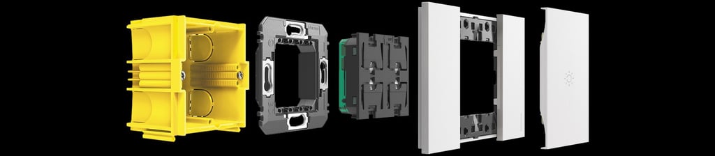El sistema domótico MyHOME_Up para Living Now, utiliza tecnología de instalación BUS, con caja de empotrar y soporte correspondiente, haciendo la configuración con la App.