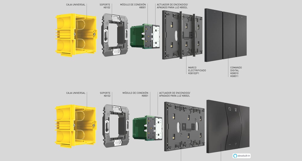 Los comandos digitales y de control por voz se instalan en su caja de empotrar y soportes correspondientes, utilizando un marco electrificado con contactos de alimentación para el dispositivo de control de 27 V CC. El módulo para la conexión al BUS del sistema y cualquier actuador de empotrar van instalados en el soporte.