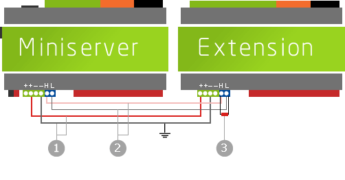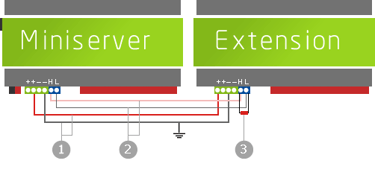 Conectar la alimentación de 24V DC del Miniserver con la entrada de alimentación de la Extension.