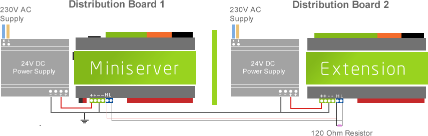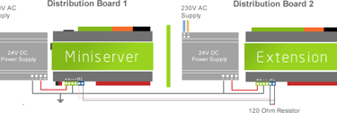 Terminar el bus Loxone Link en la última Extension con una resistencia de 120 Ohmios (se suministra en cada Miniserver).