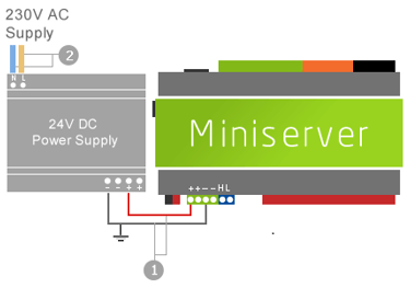 Conectar la salida de la fuente de alimentación de 24V DC con la entrada de alimentación del Miniserver.